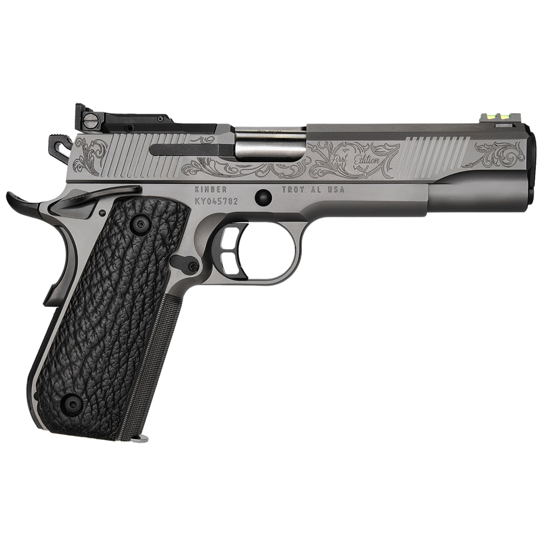 Next Generation Midnight Custom First Ed 45ACP 5″ DLC Gray Finish Slide w/ Serrated Flat Top; Southern Trapper Genuine Shark Skin Covered Walnut Grips; TAG Precision FiberLok2 Front Sight; Optics Ready; Ambi Safety; GT Trigger; External Extractor; 2x7rd Magazines