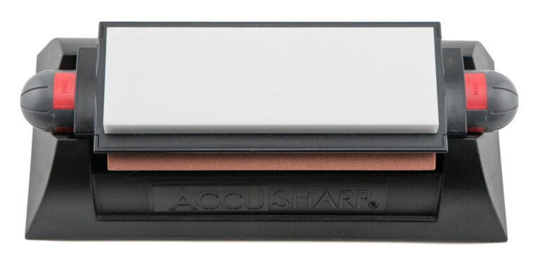 The AccuSharp Deluxe Tri-Stone Knife Sharpening System features a course diamond-coated steel allowing you to easily sharpen and hone any straight-edge blade with ease. AccuSharps three stone surfaces include coarse diamond, medium alumina-oxide and fine ceramic. This Tri-Stone System provides extra durability and safety on any surface with a rubber-grip base which prevents sliding while sharpening and honing your knives. Additionally, the deluxe Tri-Stone Sharpener base can be mounted to most countertops for extra stability. Includes an angle guide to assist in maintaining a consistent angle while sharpening. Grits Diamond Coarse 320, Synthetic Medium 280, Ceramic Fine 1500.