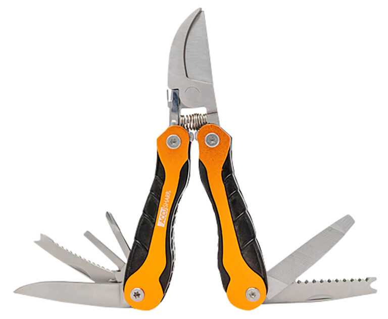 The Sportsman’s Multi-Tool is a pruner, clipper, shear, accessory tool designed for the sportsman and the great outdoors. From clearing small branches from tree stands and blind areas and cleaning birds after the hunt to a wide array of other outdoor uses. With a saw, fish scaler, knife, hook remover, small ruler, nail file and multiple screwdrivers. Includes compact carry case with belt loop for easy transport and storage.