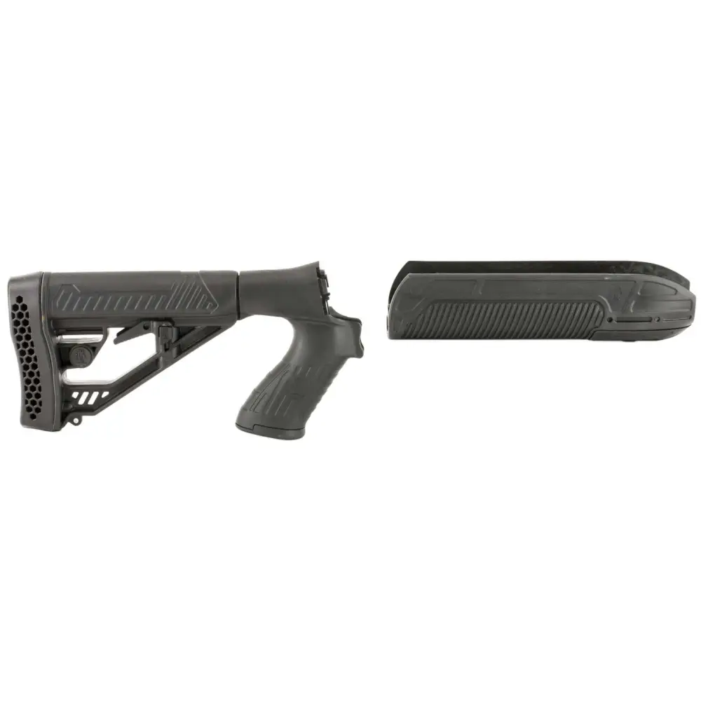 Optimized for pump shotguns, the advanced design features and high-impact, polymer construction of Adaptive Tactical’s EX Performance Adjustable Stock and Forend make it an ideal choice when upgrading your Mossberg 500 & 88 (see NOTE), 590 series 12 gauge pump shotgun. The EX Performance Forend features a 2″ Picatinny rail concealed under the nose cap. Uncovered, it is ideal for attaching tactical accessories such as lasers or lights. It is constructed of durable of high performance, lightweight polymer. The EX Performance M4-style stock with pistol grip features an easy-to-reach rapid adjust lever for custom length-of-pull, and includes an integrated QD swivel attachment and molded in non-rust standard sling swivel attachment. It features durable polymer construction with non-slip vented rubber recoil pad, oversized extra strength adjustment pin, and sleek industrial design.