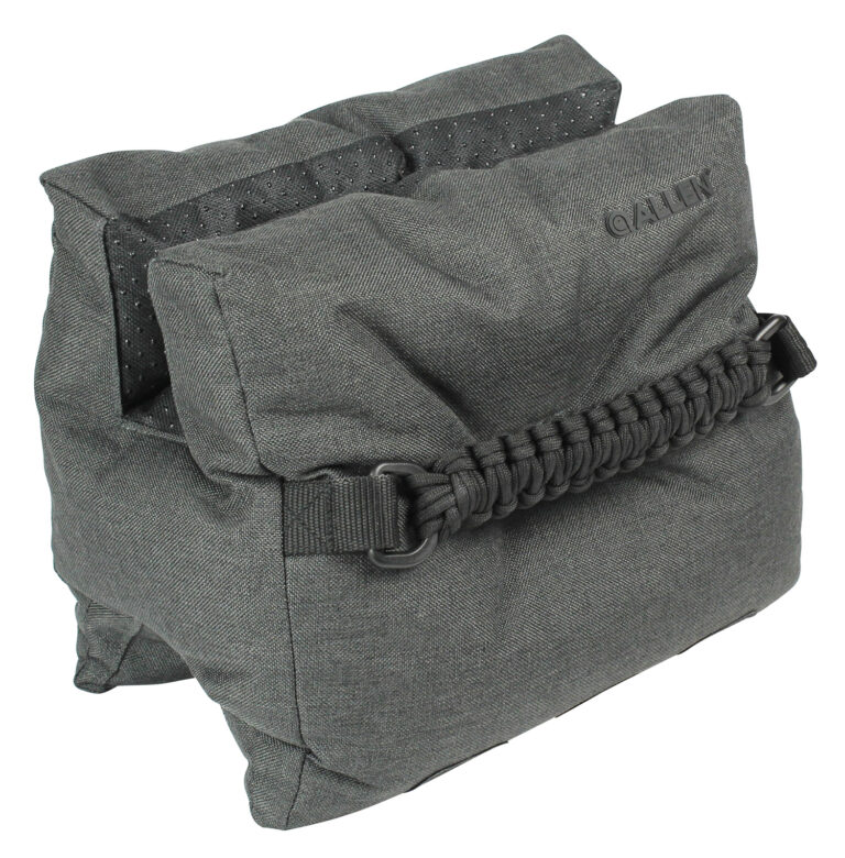 The Eliminator Front Shooting rest makes sight-in easier. The gun can easily be moved to acquire the target, yet stays steady on the semi-tacky surface. One strap is made up of a paracord handle to improve the grip and carrying experience. The front rest has an integrated 4-round rifle cartridge carrier made from elastic and thermoplastic.