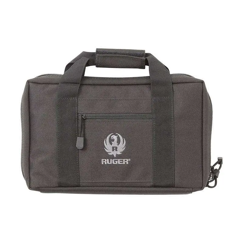The Ruger Double Handgun Case features two internal handgun compartments, internal magazine holders, and an external MOLLE system. The case has extra-rugged Endura fabric construction with a hook and loop closure carry handle. Internal dimensions: 12.5″ wide x 8″ high.