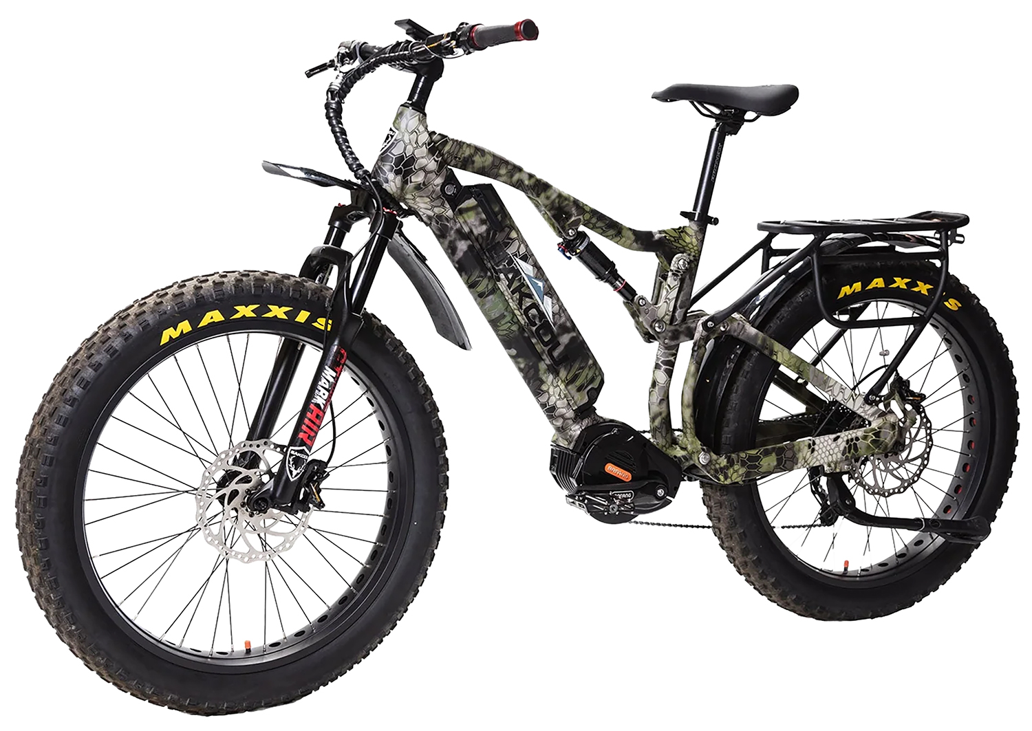 The full-suspension Storm G2 was designed and engineered around the unparalleled power and performance of Bafang’s ULTRA mid-drive motor. The Ultra motor is widely recognized as the diesel engine of fat tire electric bike mid-drive motors! For this reason, the rear suspension of the Storm G2 had to be just as heavy-duty, in order to handle all that torque and power without causing the frame to flex under intense loads. The Ultra motor is also referred to as a smart motor. The speed, cadence, shift, brake, and torque sensors provide continuous feedback from the rider to the motor. As a result, this allows the motor to deliver exactly what you ask. What you get is a very natural feeling ride, even while providing a tremendous amount of torque and power output. Featuring a Bafang M620 Ultra smart torque sensing G510 motor, capable of falling under all three classifications of electric bike laws. Toggle between 750 watts and 1,000 continuous watts with a max power output of 1,500 watts; extended distance 48v 25ah Li-Ion battery; 160NM of Torque/1500 Peak Wattage Output performance; Tektro HD E730 Quad Piston Hydraulic, 203mm front & rear brakes; RST Renegade Air Fork (120mm of travel) & Rockshox Monarch rear suspension; frame size: 19″ large for 5’10” and taller; removable left thumb throttle; 150mm 12mm Thru Axle Front Hub/Rear Hub 3/8x 26 tpi 190mm wheels; Sram 9sp, 40t front and Sram 11-34t rear cassette gears; 740mm locking, ergonimic handlebars for greater stability; side rear Derailleur Guards; SR Sport Saddle and aggressive skid-proof wide stance pedals. Includes extended distance 48V 25ah Li-Ion battery, rear pannier rack and 4 AMP smart charger. *Note- Bakcou recommend the 19″Frame for riders 5’10″”and taller. The 17″ frame is recommended for riders who are 5’7″-5’10”. If you are shorter than 5’7″, we recommend a step-through model bike.