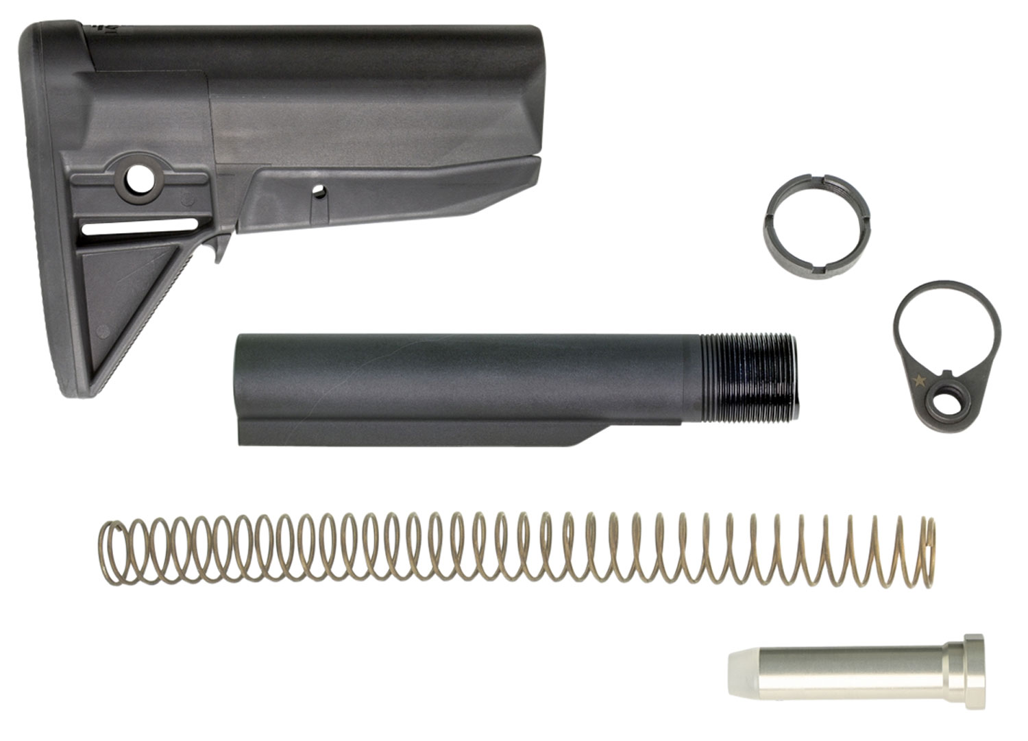 The BCMGunfighter Stock kit has a strong light-weight polymer stock for a mil-spec receiver extension. It features a snag free design, a modular VBOST (Vehicle Borne Operations Sling Tab), two different types of ambidextrous sling mounting options, including QD swivel sockets, a BCM 7075T6 Mil-Spec receiver extension, locking M4 nut, Mil-Spec carbine action spring, carbine buffer, and a BCM QD swivel mount end plate. This model has a black finish.