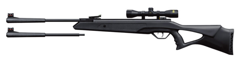The Longhorn II is a spring piston powered, dual caliber brake barrel air rifle. It features a synthetic stock with a pistol grip, fiber optic sights and a 4×32 scope with mounts.
