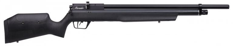 The Marauder goes lightweight with an all-weather, synthetic stock and an ambidextrous raised comb, designed for well-balanced for carry in the field. This powerful PCP air rifle offers all the features needed for pest hunting small to medium sized game. The choked and internally shrouded barrel provides both precision and ultra-hushed operation, producing the most accurate and quietest rifle in its class. The two-stage, adjustable, match-grade trigger system helps to make every shot smooth and steady, while the innovative 10-round magazine (8-round in .22) allows for fast follow-up shots. With the built-in pressure gauge and quick-disconnect Foster fittings, this gun is quick and easy to fill so you can refill and return to shooting sooner. The ambidextrous bolt has been adapted for a cleaner look and to keep the action debris-free. The simplified breech design makes for ease of assembly and service while providing a more stable platform for larger scopes. Benjamin made top secret changes to the valve resulting in a 12% power increase and a 30% increase in shot count (.22 and .177). The Marauder has a Dovetail mounting rail, sling mounts and a factory installed de-pinger to change the sharp “ping” to a dull thud resulting in a less-perceived noise level.