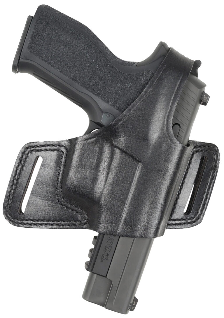 The Black Widow belt slide holster is worn on the hip and offers an ultra hi-ride carry and a thumb snap closure. The dual belt slots provide stability, and its open muzzle design offers pistols of the same model with different barrel lengths. Its compact profile and widely spaced belt slots allow the pistol to ride close to the body for both comfort and concealability.