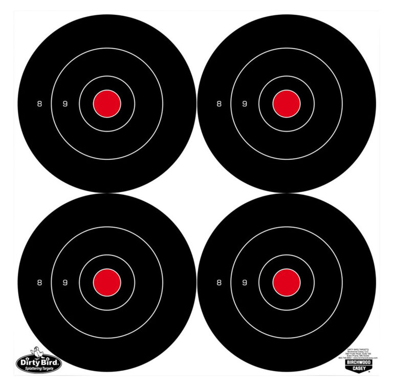 Birchwood’s Dirty Bird Bull’s-Eye Targets help spot your shots easily with white splatter contrast. The heavy tagboard targets are great for indoor or outdoor longer range shooting. The target is non-adhesive which allows you to affix to any surface you wish, add notes and easily save the targets for future reference.