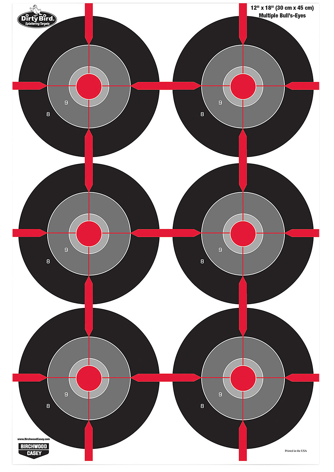 Birchwood Casey 35705 Dirty Bird Multiple Bullseye Tagboard Hanging Pistol 12″ x 18″ Black/Red/Gray White Impact Splatter 8 Per Pkg