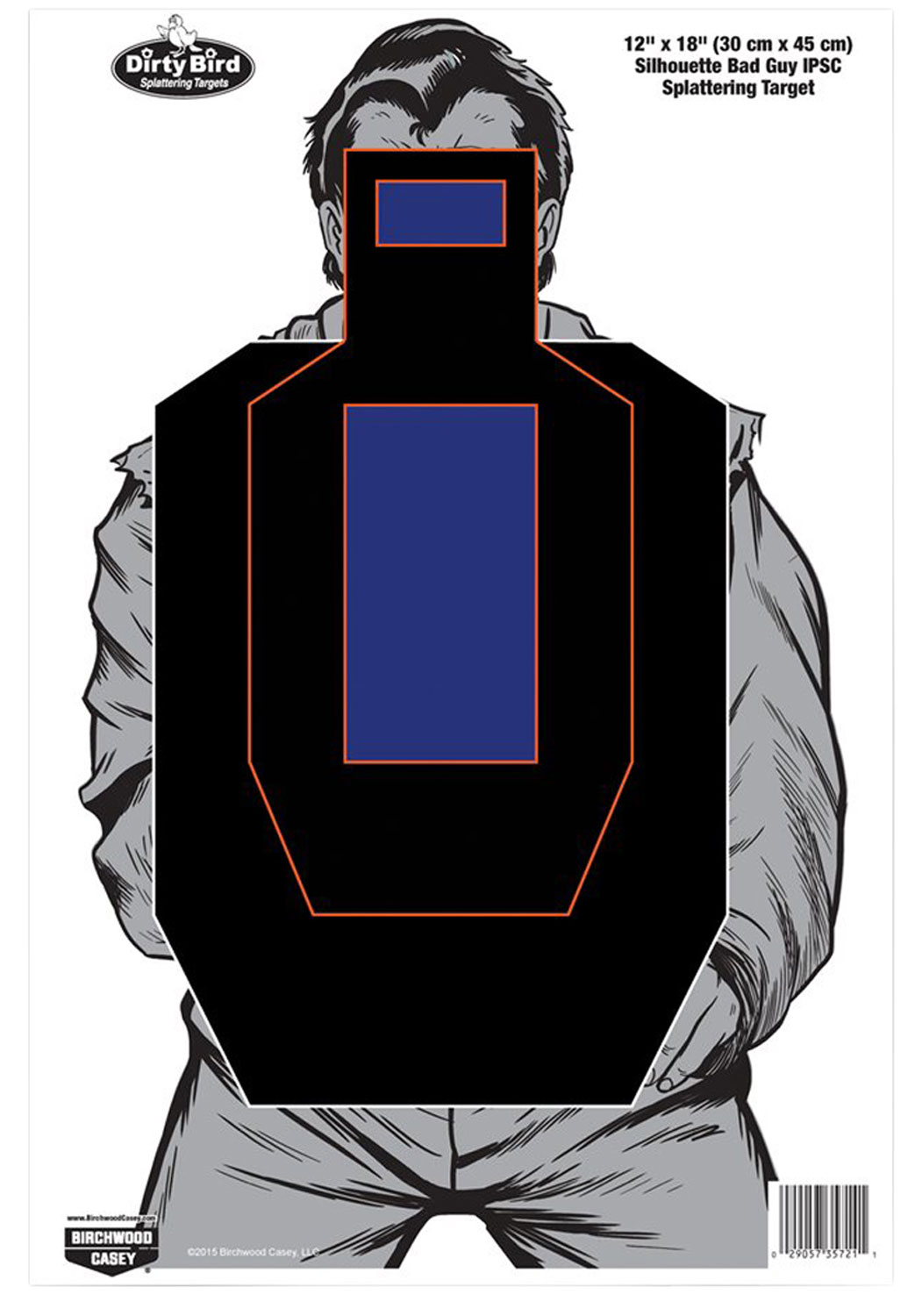 Birchwood Casey’s Dirty Bird Bad Guy IPSC target allows you to spot your shots easily with “intense white” splatter for superior downrange contrast. The heavy tagboard construction is great for indoor or outdoor use and all types of pistol-action shooting. The non-adhesive back also allows you to affix to a surface as you wish, add notes and then save the targets for future reference. Perfect for all shooting or training applications.