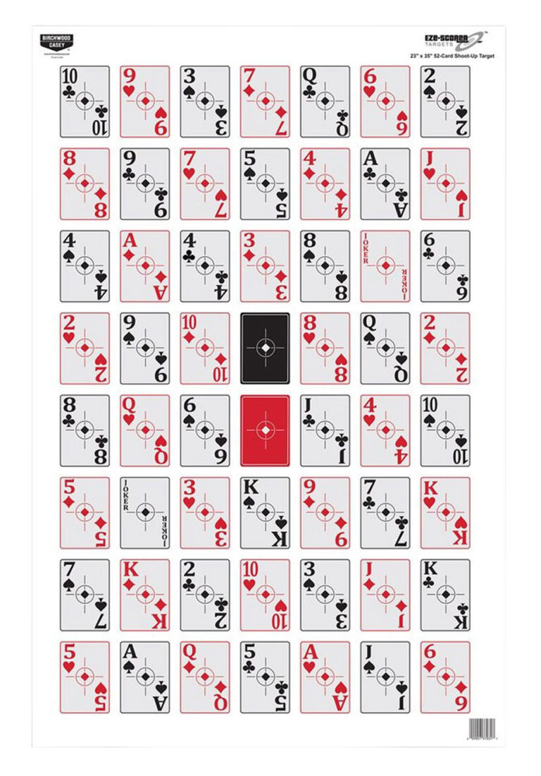Birchwood’s EZE-Scorer 52-Card Shoot-Up target is a full set of playing cards. Printed on white paper. Great for indoor and outdoor ranges.