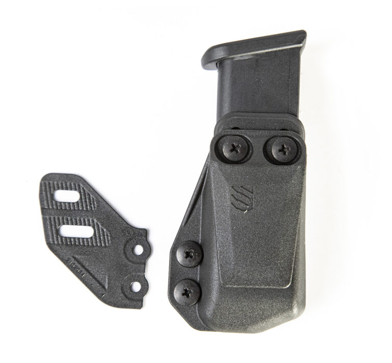 Offered in various sizes to suit the individual user’s magazine size, the Stache IWB magazine carrier is designed to ensure that no matter what your carry pistol is, it won’t go hungry when the moment comes. Constructed of injection molded, impact reinforced polymer; this magazine carrier is designed for life-long use. Integrated, passive retention adjustment screws allow the user to tailor the friction of the magazine carrier to their preference; as well as providing a seamless and integrated mounting point for popular, aftermarket Discreet Carry Concepts Gear Clips. Provided appendix platform accessory wing allows the user to join their magazine to their existing Stache IWB Base model and create their own appendix platform if they so choose. Magazine carrier and provided 1.5″ J-Style belt clip are both ambidextrous, offering maximum versatility regardless of hand dominance or carry preference.