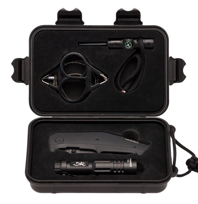 The Browning Outdoorsman Survival Kit Combo includes a blade assisted opening 8Cr13MoV stainless steel drop point blade with stonewashed finish and anti-skid grooves on blade spine with a black G-10 handle; pocket clip; two-finger stainless wire saw with figure 8 pull rings; flashlight with spot-to-flood beam and push button switch produces 50 lumens on high and 10 lumens on low from one AA battery (included); polymer handled combination fire starting flint/compass/survival whistle and a compact waterproof polymer case with O-ring seal.