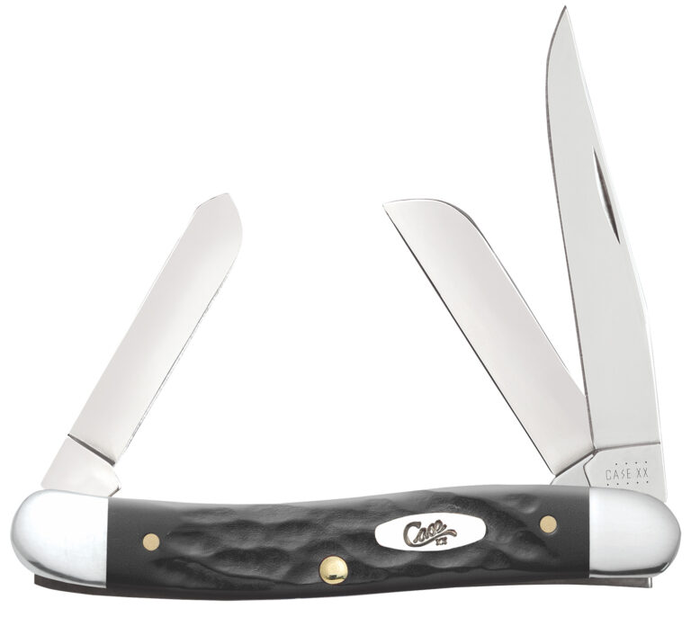 The Case Medium Stockman is a part of our Rough Black Family. This rugged, synthetic handle is inspired by our Gum Fuddy knives of World War II. Stockmans pack three blades in a convenient but very practical pocket knife. The Clip and Sheepfoot blade sit on the pocket end while the Spey blade sits on the cap end. The Clip blade is commonly used as a multi-purpose blade and preferred for detail work. The Sheepfoot blade allows for added strength at the point making it great for carving and achieving a clean cut. The Spey blade is commonly used as an all-purpose utility blade. This knife is made with Case Tru-Sharp stainless steel blades and a jigged black synthetic handle. Made in Bradford, PA, USA from domestic and imported materials.