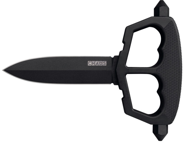 A D-guard push knife designed from the ground up to thrive in the toughest military and special operations environments. Made with a broad, double edged blade that’s honed to razor sharpness, it cuts, slashes and thrusts like a chainsaw on steroids. The handle is injection molded form Griv-Ex with Kray-Ex over-molds for comfort and shock resistance. It allows for multi-directional percussion blows due to its twin skull crusher pommels, which are removable. Includes Secure-Ex sheath with a Cordura belt loop.