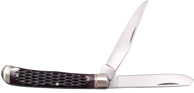 The Cold Steel Trapper Folding Knife features handles with authentic bone and are highlighted with polished metal bolsters. The rugged handles are substantially sized for hard work, even with gloved hands. It is constructed in a traditional Jack Knife pattern, with two polished blades, a clip point blade for piercing and cutting and a spey blade for skinning and gutting, both folding out of one end of the knifes grip.