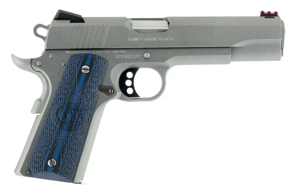 Colt’s 1911 Competition pistol features custom G10 blue grips with a scallop design, dual recoil spring system, a National Match barrel. It has Novak sights for precision shooting; a red fiber optic front with adjustable rear sight. It comes with a magazine and spare sight fibers. This 45 ACP model has a brushed stainless steel metal finish and a 70 series firing pin system.
