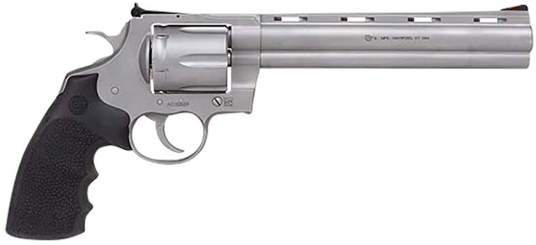The Colt Python is a stainless steel double action revolver with rugged matte finish for everyday use. Features a lea spring action that provides a non stacking smooth as glass trigger pull; user interchangeable, red ramp front sight and adjustable target rear sight and Hogue OverMolded rubber grips.