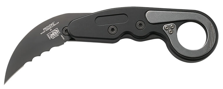 The Provoke is the first knife ever to feature Kinematic technology, it stays neatly tucked away in transit and comes to life when there’s trouble. Thumb pressure on the upper crossbar sets the chain reaction in motion, causing the blade to lunge to action while you’ve got a firm grasp on the handle. Features a D2 steel blade with black titanium nitride coating for enhanced corrosion resistance and durable and lightweight hard anodized aluminum handles.