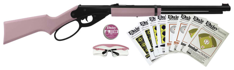 This Kit Includes: The Daisy Pink Lever Action Carbine is a classic BB gun featuring a pink synthetic stock and forearm. Producing 350 feet per second velocity with standard .177 caliber BBs, the Pink Lever Action Carbine is a wonderful training tool for introducing youth to shooting. Daisy Fold-N Fire Target350-Count BB Tube. Pink Shooting Glasses
