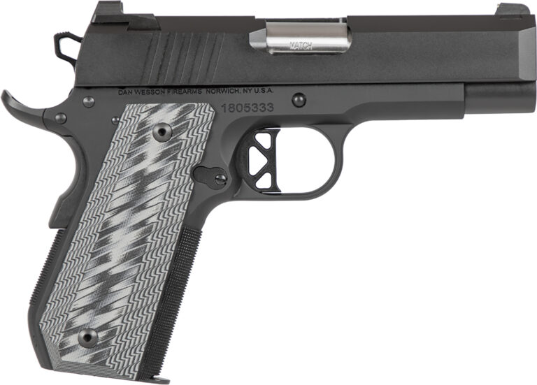Dan Wesson’s bull barrel is flush-cut to make for easier disassembly and has a 30 degree crown. With a flat wire recoil spring that is rated for 15,000 rounds. With a compact, stainless steel slide and a forged aluminum frame, the weight is at 29 oz. The tapered G10 grips and a bobbed mainspring housing enhance its ergonomics, affording shooters with smaller hands an easier reach to the trigger. A tri-topped slide wears aggressive side serrations and a top rib to knock down glare, while our new U-notch rear sight is matched to our brass-beaded front sight.Includes two magazines.