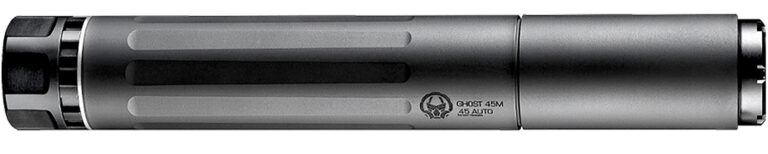 The .45 Ghost-M is a modular centerfire multi-caliber pistol/subgun suppressor that is rated all the way up to 300 blackout sub-sonic. The Ghost is full auto rated and features a unique patent pending modular design. Break it down to the short configuration and you have the smallest and quietest .45 can in its class. When its time to be scary quiet, the Long configuration is the way to go. A combination of 17-4 stainless steel, titanium, and anodized 7075 aluminum materials in all the right places ensures rugged reliability and minimum weight.