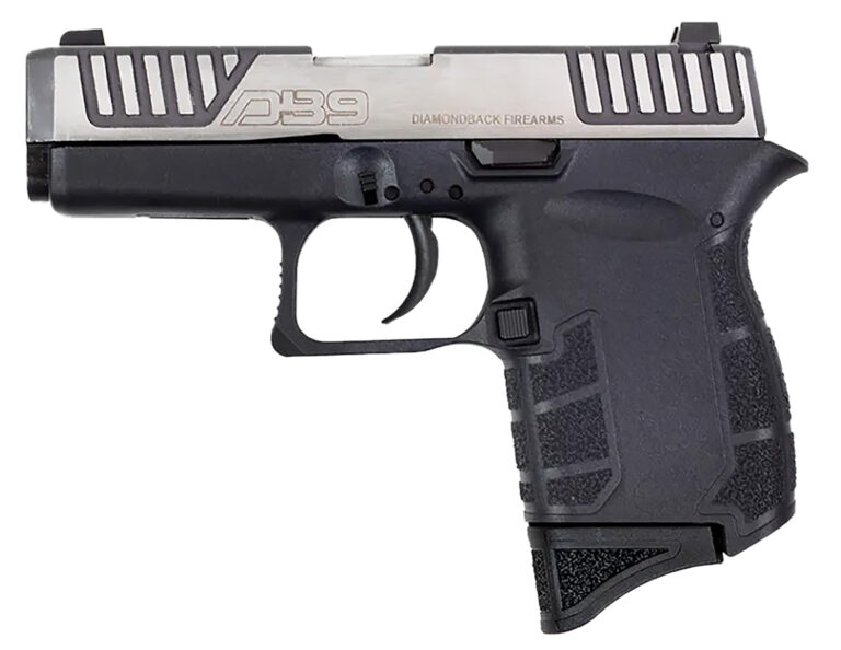 The Diamondback DB9 G4 is a micro-compact 9mm pistol made entirely in the USA. Designed with safety in mind, the DB9 features a “ZERO-Energy” striker firing system with a mechanical firing pin block; a steel magazine catch to secure a sheet metal magazine; real windage-adjustable sights; steel trigger with dual connecting bars allows for a crisp, smooth, trigger pull; FEA (Finite Element Analysis) designed slide and barrel that is stronger than any comparable firearm, resulting in durability with less felt recoil, and the absence of removable pins or tools makes field stripping easier than ever. The slide, barrel, and internal parts are coated to resist corrosion, making this pistol a lifetime investment.
