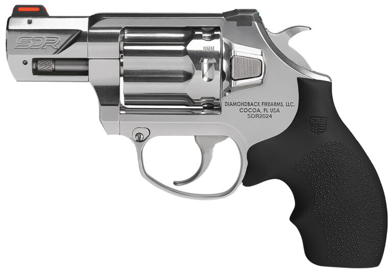 The Diamondback SDR revolver features a SA/DA; stainless steel frame, cylinder and barrel; Hogue rubber grip with a Diamondback logo; fixed fiber optic orange front sights; low profile Dovetail fiber optic green rear sight, a trigger pull 9 lbs – 11.50 lbs.