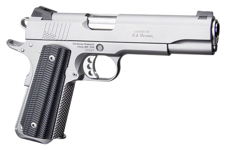 Classic 5″ Government balance married to modern performance and unapologetic American styling. Chambered in .45 ACP, this single-stack 1911 pairs an exclusive snakeskin forestrap and mainspring housing with American Flag rear serrations, black Alien G10 grips and bold engravings with the 2nd Amendment on the slide and FREEDOM on the bushing for a pistol that commands attention on the range or in a collection. Includes Ed Brown pistol bag, two Ed Brown Performance Magazines with base pad kits, lubricant, owners manual, bushing wrench, grip screw wrench and cable lock.