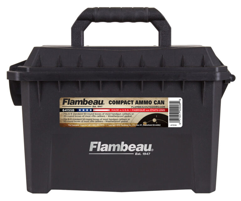 The Compact Ammo Can features a durable polymer construction with a weatherproof gasket, OTC latch, and carry handle. It is compatible with 6-9 50-round boxes of most handgun calibers; 20-round boxes of .223 REM/5.56; five (5) boxes of 20-gauge – 2.75″/3″; four (4) boxes of 12-gauge – 2.75″/3″/ two (2) 12 gauge boxes 3.5″. This model has a black finish.