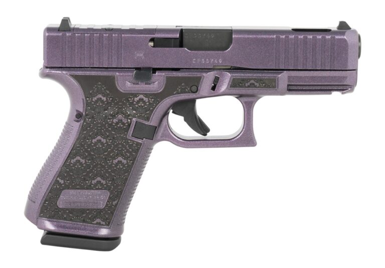 Every Glock Cover-Up model ships with an optic-cut slide- RMR footprint, ported barrel & slide for reduced muzzle rise and faster follow-ups. The Amethyst color-shifting purple finish with delicate floral engravings that catch the light and the eye. The GLOCK 19 Gen5 pistol in 9mm Luger is ideal for a more versatile role due to its reduced dimensions. Gen5 features flared mag-well has a larger funnel; Glock Marksman Barrel (GMB) more aggressive polygonal rifling with a target-style crown and tighter chamber specs; ambidextrous slide stop levers offer increased ergonomics for left-hand shooters and shooting with the support hand; removal of finger grooves; Safe Action System, safeties disengage sequentially as the trigger is pulled and automatically re-engage when the trigger is released; enlarged floor plate makes it easier to pull the magazine free of the pistol and customizable frame size with backstraps in two sizes with beavertail. The multiple backstrap frame allows the users to change the circumference of the grip to fit their individual hand size. Includes three magazines, mag loader, cleaning kit, pistol case and gun lock.