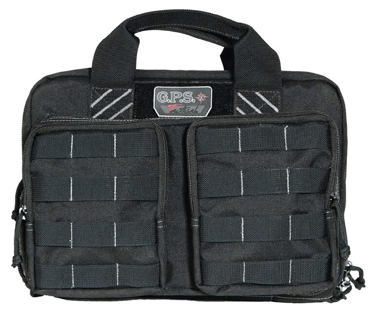 The Tactical Quad +2 Pistol Case stores up to 6 handguns utilizing the two removable padded pouches. It has a double quilted inside storage area, 8 backside magazine storage pouches, twin front ammo pockets with triple-stitched MOLLE webbing with a YKK locking zipper on the main compartment for legal transport. It has a hook and loop GPS Tactical logo patch, removable to personalize with a name or club placard. Visual ID storage areas have velour-lining to protect glasses and ear pieces. The GPS Tactical line of gear is made of 1000 Denier heavy-duty material with DuPont Teflon coating for grime resistance and is sewn with mildew- and rot-resistant nylon-based thread using Box and Bar tack reinforced stitching in all critical areas.