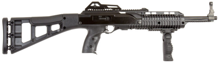 Hi-Point’s 3895TS 380 ACP carbine has an all-weather, polymer skeletonized stock with an internal recoil buffer, multiple Weaver-style rails, a sling, swivels, and scope base. It has a quick on/off thumb safety, grip-mounted clip release, last round lock open feature, and fully adjustable sights (post front, peep rear). The 3895TS carbine has a 16.5″ barrel for an OAL of 31″. Hi-Point produces affordable, American-made firearms featuring 100% American parts and assembly. Hi-Point carbines are +P rated and accept all factory ammunition. This model features a forward folding grip. It has a black stock with black metal finish and includes a 10-round magazine. (The mag is not compatible with CF380)