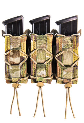 This line of polymer TACOs functions much the same as their nylon counterparts. The body and brackets are made with a durable and flexible, proprietary polymer and are laced together with a bungee cord. As with the originals, these pouches grip and retain a wide variety of magazine styles and calibers. It mounts to both MOLLE and belts up to 2″ with High Speed Gear’s universal HSGI Clips, has a pop lock configuration that orients excess bungee down and out of the way, and features grommets for drainage.