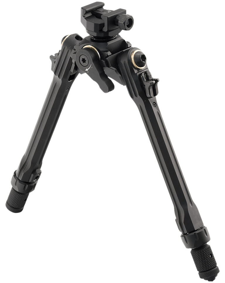 3 Position Folding with Steel-on-steel Lockup. Low Profile Picatinny Mount Features Tension-adjustable 360 Panning & 19 Forward, Rearward, Left, and Right Tilt. 8.5″-11″ Center Height Adjustable. Automatic Leg Retraction. Patented Height Adjustable Spiral Guided Leg Extensions with Steel Ball Bearing Detent Ring Locks Manages Height Adjustment and Retention. Interchangeable Foot Pads Compatible with Most Aftermarket Pads with QD Locking Detent. Type III Class 2 Matte Black Hard Coat Anodized 6061-T6 and 7075-T6 Aluminum Construction with Reinforced Steel Components