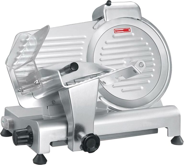 Perfect deli cuts of your favorite boneless meats are always within reach thanks to this heavy-duty commercial grade slicer. Finely honed blade rarely needs to be sharpened even with frequent use. A sharpener is included for when it comes time for sharpening. Sliding carriage and food holder arm ensure consistently smooth and precise cuts. To adjust thickness just turn the graduated knob. This slicer will slice as thin as 1mm or as thick as 10mm (.4") and any thickness in-between. Strong 0.4 HP motor. Skid-resistant rubber feet. Replacement belt and replacement blade sharpening stone included. Note: Not suitable for slicing frozen foods or non-food items. ETL Certified. ETL Sanitary Certification.