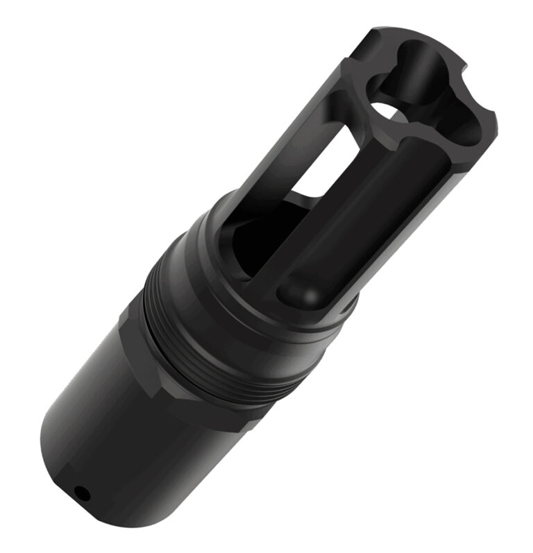 3.05 total length takes 13.7 barrels to 16.1 for legal rifle barrel length requirements. All critical alignment features machined in one set up. Compatible with common .900-24 silencer mounts like the Q Plan-B and Rearden MFG Atlas. .30 caliber bore. 13/16 rear hex for easy installation and removal. CNC machined from 17-4 PH stainless steel. Heat treated to H900 condition. Substantial flash reduction over OEM part. Designed to serve as sacrificial blast baffle. Square shoulder. 360 degree port orientation-no shims required. 3.5 ounces, 3/32 pin compatible