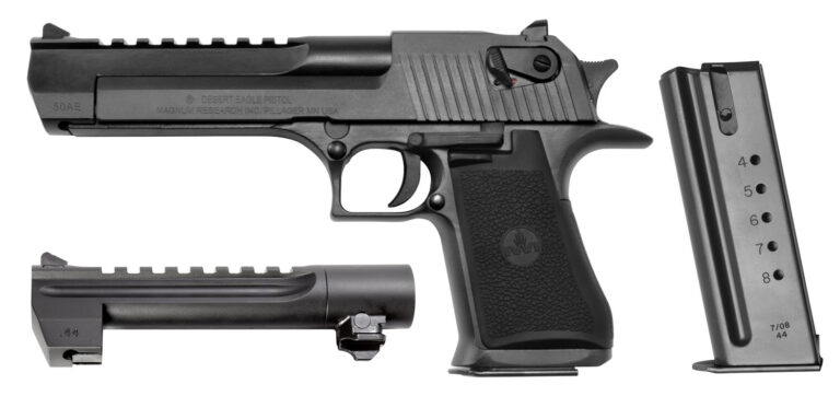 After 25 years of being accessorized, customized and re-imagined in countless movies, television shows and video games, the Desert Eagle Pistol has emerged as a pop-culture icon. It feature a full picatinny style accessory rail on the barrel from the end of the chamber to right behind the front sight and standard ambidextrous safeties. The Mark XIX Desert Eagle is a gas-operated, semi-automatic pistol with a trigger reach of 2.75″ and a sight radius of 8.5″. The construction of the Mark XIX Desert Eagle utilizes the latest CNC machine technology providing exacting specifications with tight tolerances creating a work of art in a precision firearm. The grip is anatomically formed and provides an ideal hand seating angle for two-handed shooting allowing for comfortable, rapid and accurate firing. The picatinny style accessory rail easily allows for aftermarket optics and scope rings. This Conversion combo model comes with a 44 Rem Mag 6″ barrel and 8-round magazine.