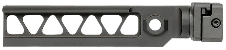 Heavy-duty side-folding mechanism constructed from 4140 steel. Full-length locking lug for maximum strength. Solid positive lock up in both positions. Steel clamp with large surface engagement. Can be configured to right or left folding. Modular design can accommodate different stock attachments. 2 QD Sling attachments. Compatible with Milspec diameter stocks. Curved top to mitigate wobble from skeletonized beam. Adds 7.0″ to overall firearm length. Adds 0.75″” to the firearm in the folded position. Complete assembly weight: 11.6 oz. Steel parts are mag phosphate finished