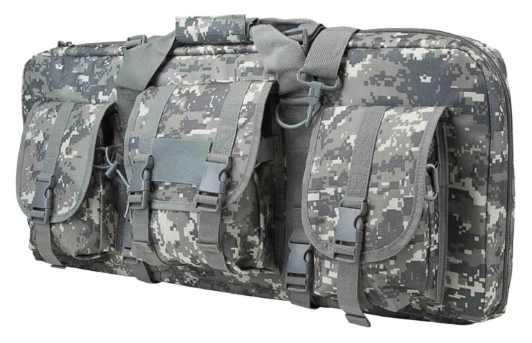 Deluxe SubGun double Pistol Carbine case allows for two AR & AK pistols, subguns, AOW or folding carbines to be transported within the padded main compartment with a padded divider to prevent weapons from contacting each other. Additional storage pouches to store mags or other gear. Each compartment has two diagonal side pocked to help secure each end of the firearm and two hook and loop straps to secure each firearm inside the case.The three large exterior pockets (2 each 7″H X 5″W and one 7″H X 7″W) to store your magazines and additional gear. Pocket flaps secure via plastic quick connect buckles, hook and loop fasteners and bungee cords help secure your gear in place. Two compression straps with plastic quick connect buckle on the top and bottom of the case to help secure your firearm and gears in place. Large Heavy Duty zippers on the main compartment with lockable metal zipper pulls. Heavy Duty padded carry handles. Adjustable shoulder strap attaches to large metal D-Rings. Case is made from heavy duty PVC material that is water and chemical resistant.