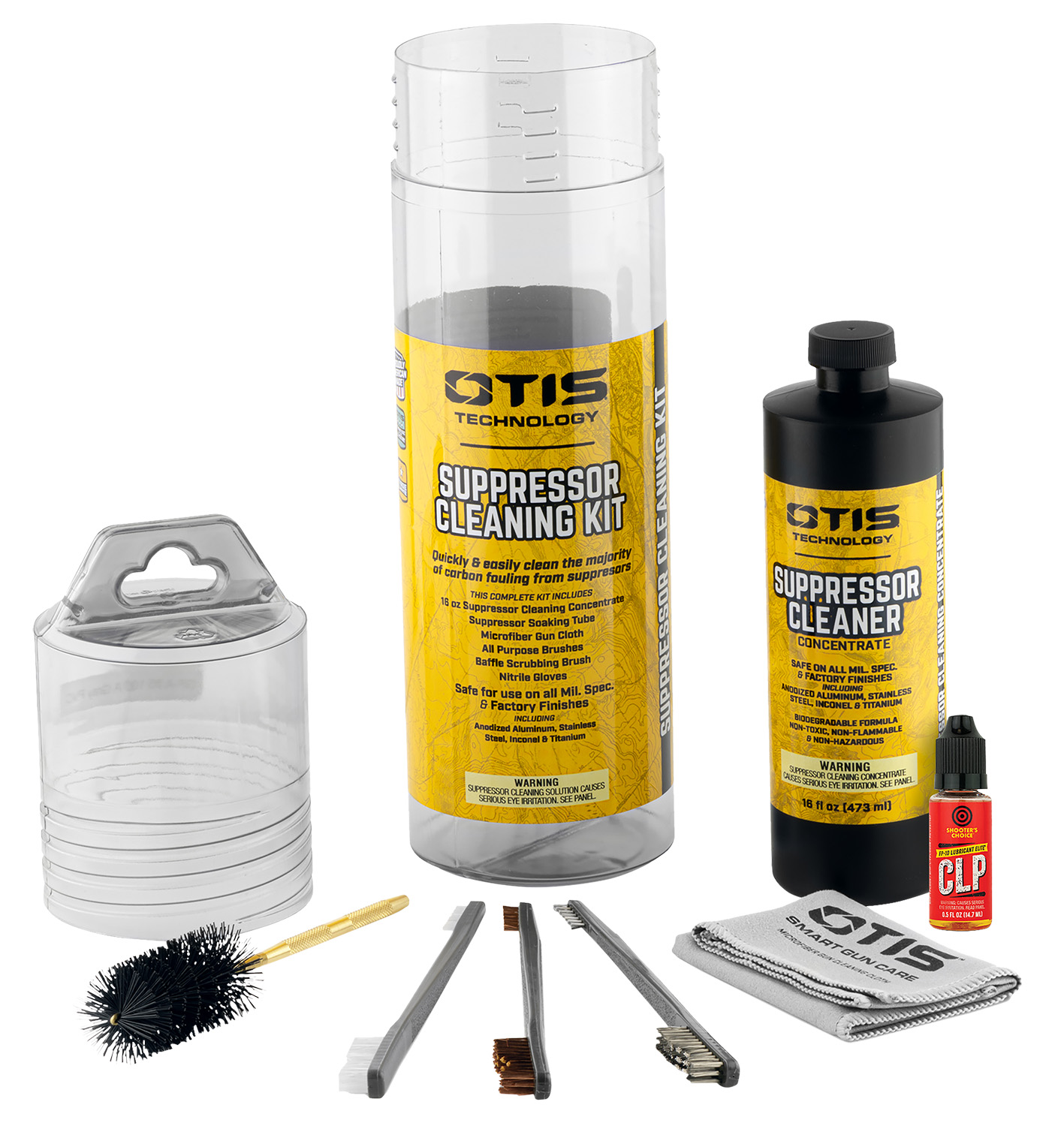 Extend the life of suppressors with the Otis Technology Suppressor Cleaning Kit. This kit includes everything needed to remove most carbon fouling and build up from suppressors- soaking container, Suppressor Cleaner Concentrate, baffle & all purpose cleaning brushes and microfiber cloth. Includes a 16 oz bottle of Suppressor Cleaner Concentrate, creating 32 oz of cleaning fluid. Nitrile gloves are also included.