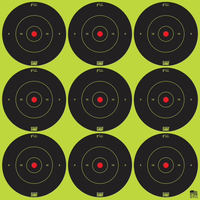 Pro-Shot’s SplatterShot Peel and Stick targets are excellent for low-light conditions for indoor/outdoor use. 2″ bullseyes. Bullet holes are revealed with bright green rings.