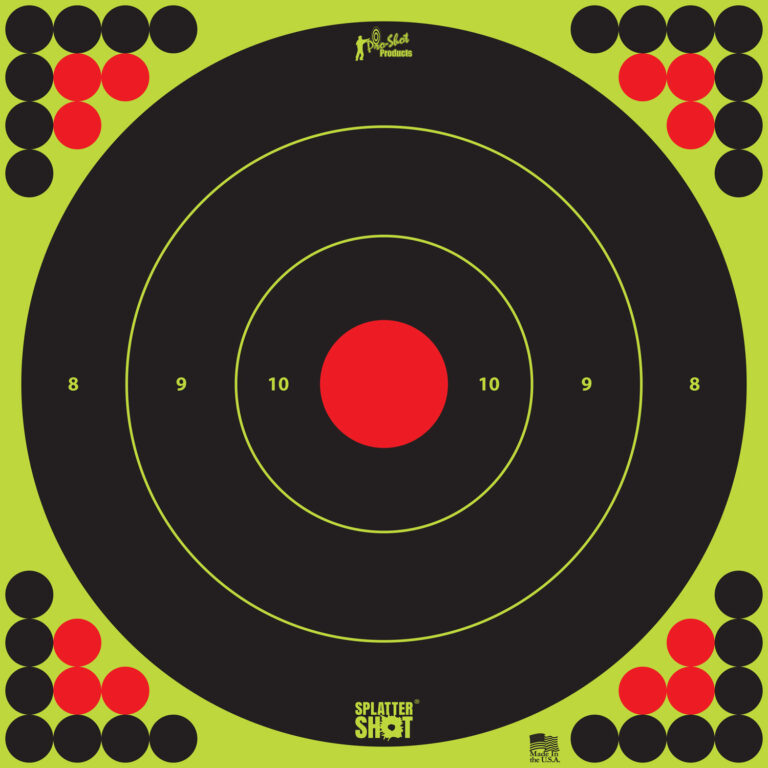 Pro-Shot’s SplatterShot Peel and Stick targets are excellent for low-light conditions for indoor/outdoor use. Bullet holes are revealed with bright green rings. Includes pasters for extended target use.