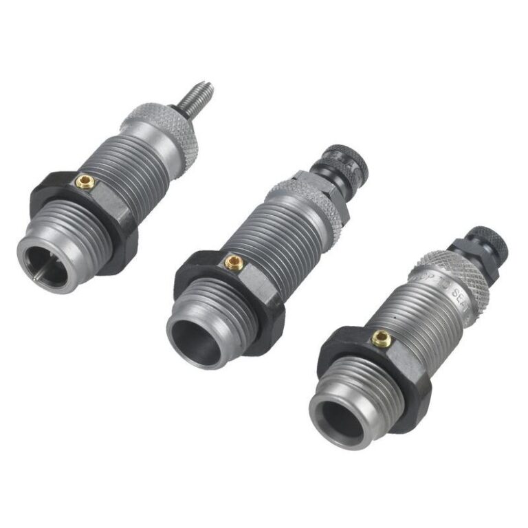 RCBS pioneered and developed 3-Die Sets for straight-wall rifle and pistol cases. The Carbide Sizer Die sizes the case and de-primes (the carbide sizer ring eliminates the need to lubricate). The Expander Die expands the case to the proper diameter to accept the bullet and it imparts case mouth flare/bell for bullet feeding. The Seater Die seats the bullet and roll crimps.