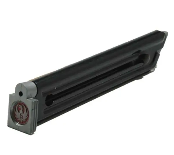 This magazine is compatible with the Ruger Mark I (Old Style), and is constructed of blued steel.