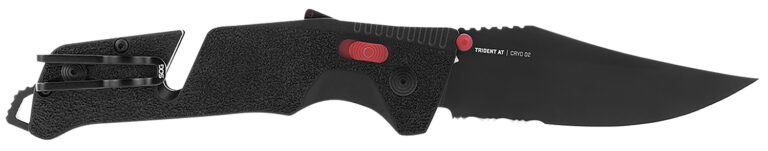 A folding knife designed for professional users, Trident AT features rapid assisted opening with SOG’s innovative ambidextrous AT-XR Lock, as well as integrated line cutter and glass breaker. Trident AT is easy to carry, with a highly functional 3.75″ cryogenically heat-treated D2 stainless steel blade. Its powerful AT-XR locking mechanism also features built-in blade locking safety and spine-mounted safety system. Features lanyard loop, line cutter, glass breaker.