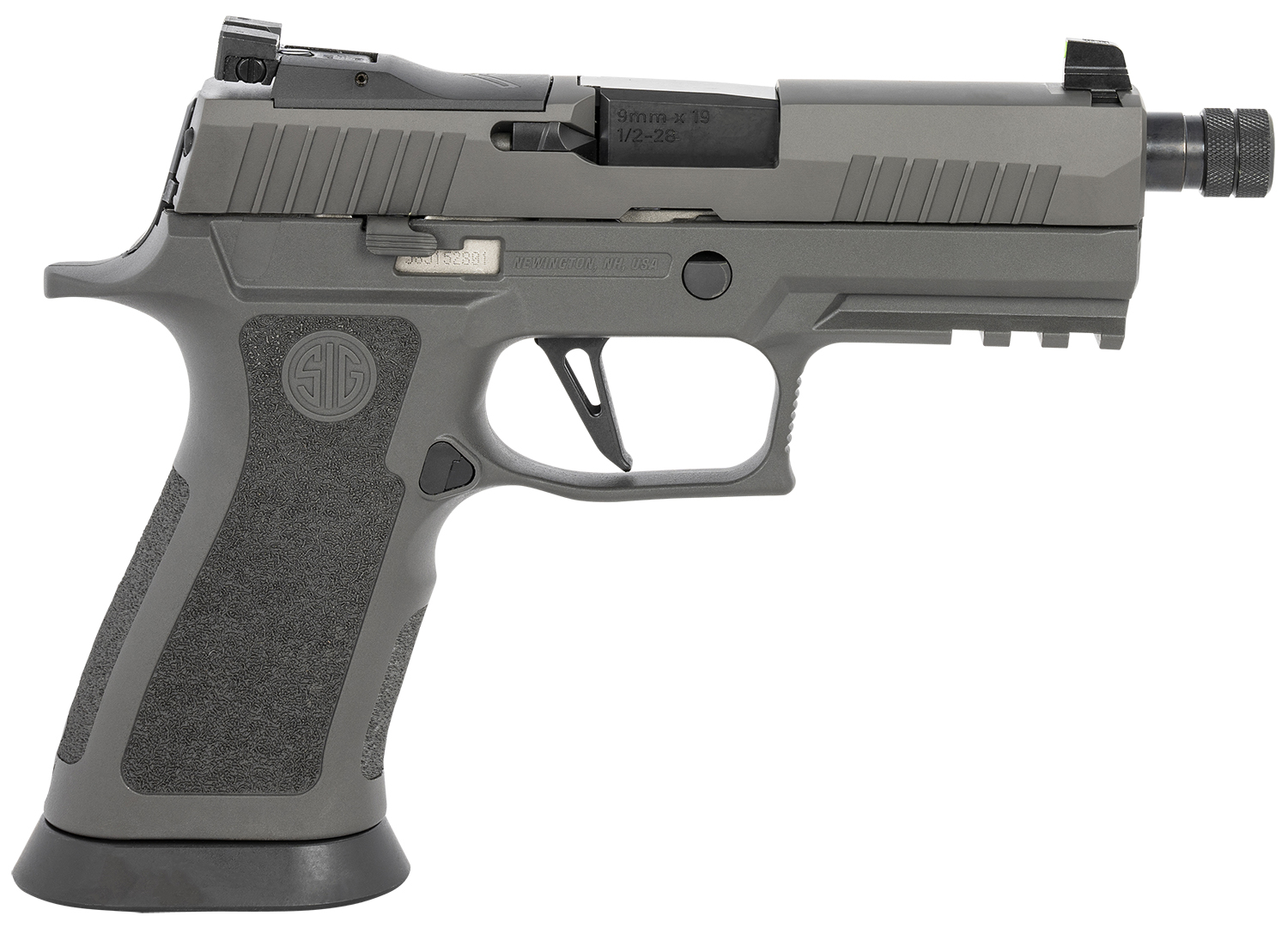 The P320 XCarry Legion pistol features TXG tungsten infused XCarry grip module and 1/2×28″ threaded barrel. It has a Legion gray PVD, optic ready slide compatible with ROMEO1 PRO, Romeo2, DeltaPoint Pro and RMR (sold separately) and features fully adjustable XRAY3 day/night sights. Includes three magazines.
