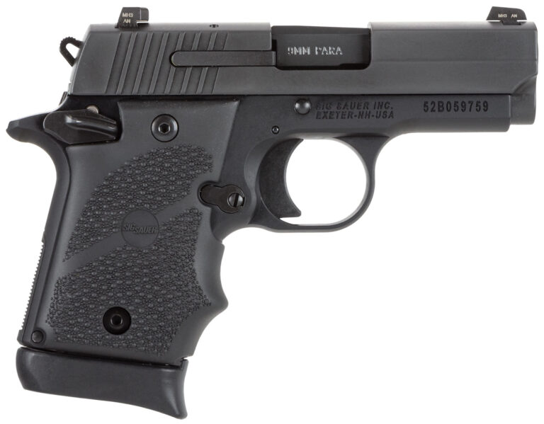The P938 BRG model features an all-metal frame and longer slide and barrel. The cocked-and-locked single-action trigger gives the P938 unmatched accuracy, while the ambidextrous safety makes it easy for left- and right-handed shooters. This model has an aluminum alloy frame with a black hard coat anodized, stainless steel slide with a black nitron finish, SigLite night sights and Hogue rubber grip.