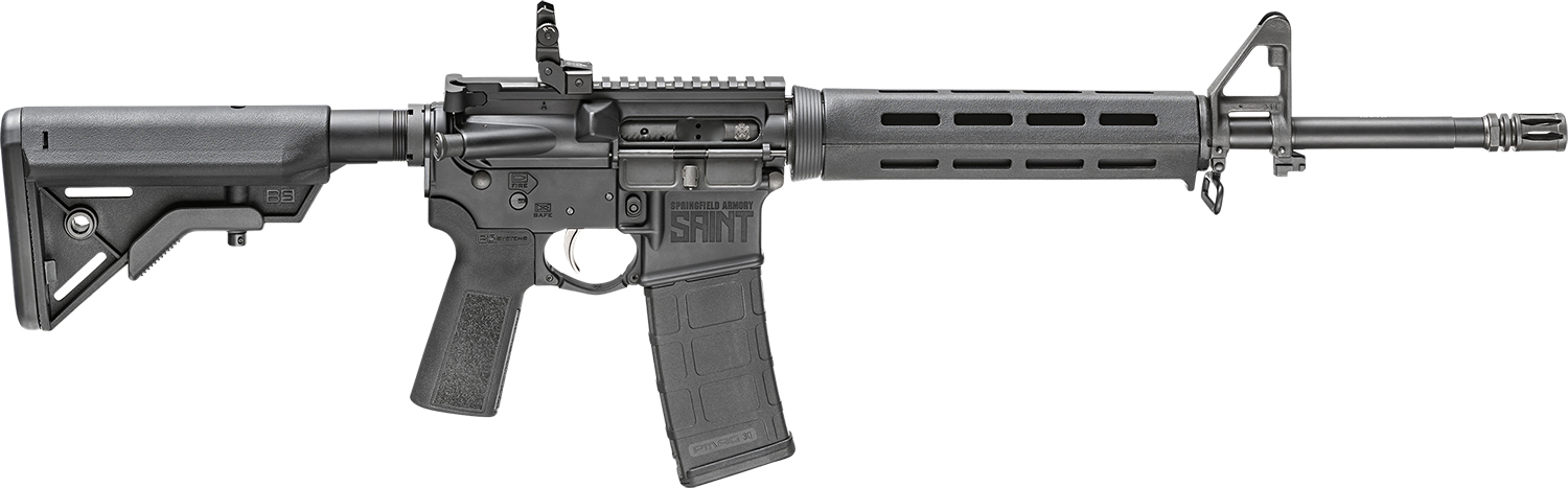The SAINT rifle from Springfield Armory offers an outstanding value in an AR-15 with top-tier components selected for rugged dependability and relentless performance. From its M-Lok handguards to upgraded triggers to the Accu-Tite receiver tensioning system, the SAINT is ready to deliver. The mid-length direct gas impingement system optimizes reliability while minimizing weight, complexity and bulk. Professional quality low profile flip-up iron sights come standard so you can run the gun right out of the box, while forged 7075 T6 aircraft aluminum receivers are Type III hardcoat anodized for rugged performance and unparalleled weather resistance. The unstoppable M16-style bolt carrier group features a Carpenter 158 steel bolt and rugged Melonite surface treatment throughout. Featuring an upgraded trigger right out of the box, the SAINT gives you the performance you need when you need it. The nickel boron-coated G.I. single-stage trigger operates smoothly and provides a clean, grit-free pull. The result is a rifle you know you can count upon when it counts.