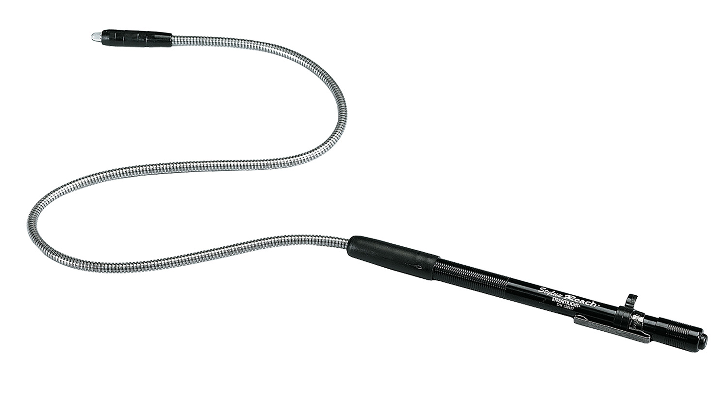 The Stylus Reach 18 is an ultra-slim pen light featuring a flexible cable extension with a high intensity LED end. Perfect for illuminating hard-to-reach or tight spaces. Machined from an aluminum, with non-slip knurled grip and flexible cable. It features a high-intensity white LED momentary blink switch and constant “on” and pocket clip. The flexible cable twist and turns into any position to help light the most out-of-the-way places and adds 25″ of reach. Includes batteries and pocket clip.